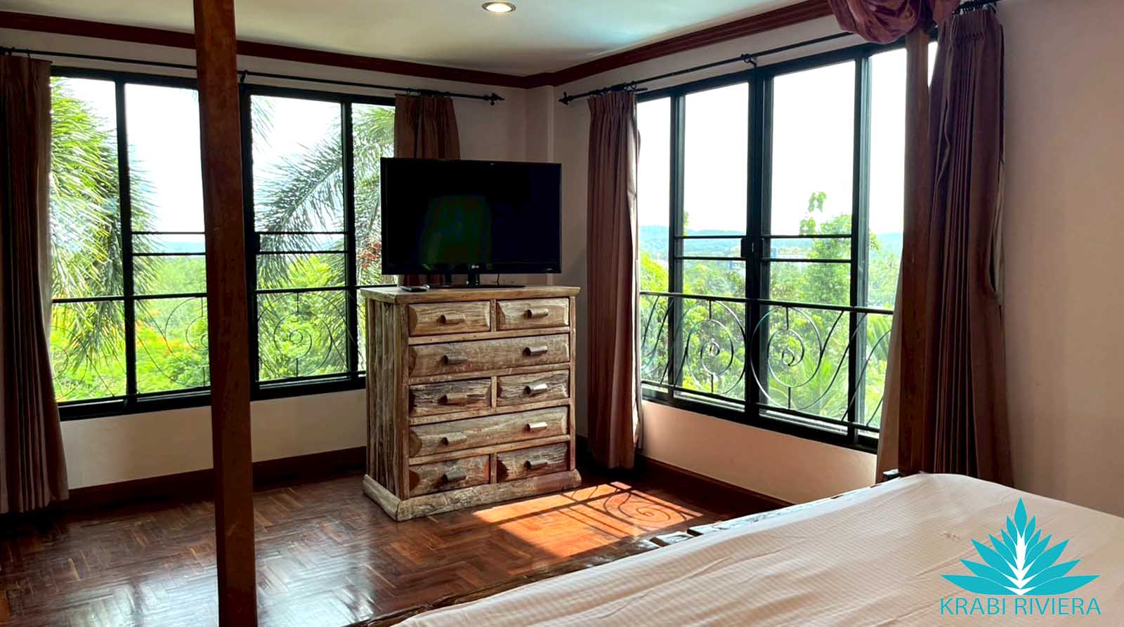 Although the front door to the property is located on the ground floor, much of the ground floor space provides an outdoor seating and barbecue area where guests may relax in the cool shade of Krabi villa above. The accommodation is sensibly arranged to ensure that guests enjoy the spectacular views to the maximum. Therefore, four of the bedrooms are located on the first floor, whilst the main living area and remaining bedroom can be found upstairs on the second and third floors. Air conditioning is available in all the bedrooms and the main living area. On the first floor, the master suite has a king-size four-poster bed, and the large windows in this room allow guests to enjoy some stunning views. There is also a luxurious en-suite bathroom with a rain shower, double Jacuzzi and stylish LED lighting. The master suite also benefits from a large TV and DVD player. There are a further three bedrooms on this floor, two of which have king-size beds, and the remaining bedroom has twin single beds. This floor also has 3 additional bathrooms, 2 of which are onsuite.